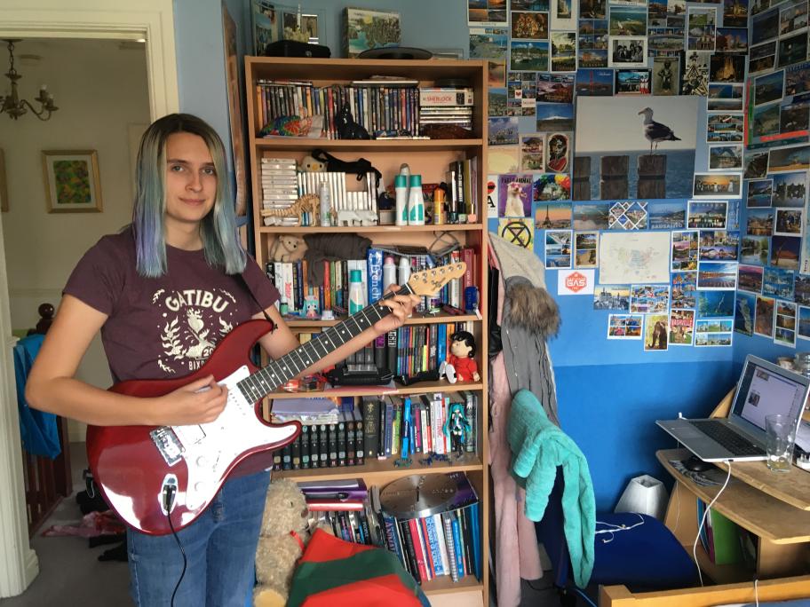 Holding a guitar